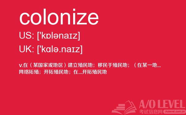 英国a-level学校,从教学质量上来看私立学校更占优势,大部分中国留学生也选择私立学校来读,不过一般都是提前一年来申请学校。中国目前也有20几所a-level学校,每年也同样有走进剑桥牛津等世界顶级大学的学生。所以在国外和在国内都可以选择a-level学校来学习。在前面关于a-level选校的问题已经详细介绍过,那么今天a/o-level考试网小编主要想介绍的是a-level重难点词汇colonize。希望对大家有帮助。如果您想了解a水准,alevel经济教材电子版,alevel国际课程,a水准考试预备班等关于a-level考试的相关资讯,请继续浏览并关注课窝a/o-level考试网。