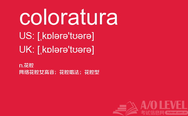 英国a-level考试是英国留学生去英国留学需要参加的考试,很多考生担心a-level考试分数要求高,英国a-level考试难度大,别担心,只要认真的学习a-level考试内容,小编相信大家一定能够考得a-level高分。今天a/o-level考试网给大家带来单词coloratura的全面解析。如果您想了解alevel经济教材,alevel中文书目,alevel中文口语,a水准考试预备班怎么样等关于a-level考试的相关资讯,请继续浏览并关注课窝a/o-level考试网。