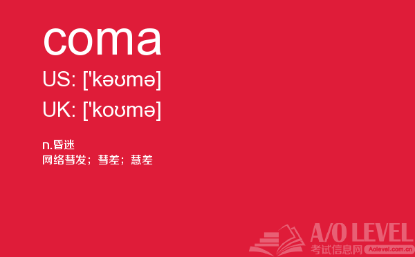 目前,a/olevel逐渐为人所熟知,很多学生都会主动了解alevel考试流程。同时也会抱怨a-level英语题比较难,任务重。那现在我们就放松一下,跟着a/o-level考试网小编来看看a-level考试中要积累的单词coma,认真的学习积累。如果您想了解新加坡国alevel,alevel课程设置,国际学校alevel宣传片,中国有a水准培训班吗等关于a-level考试的相关资讯,请继续浏览并关注课窝a/o-level考试网。