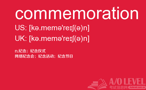 a-level的成绩分为a、b、c、d、e、u六个等级,a为最优,e为通过,u为不及格。如果学生对某门课的成绩不满意,可以选择重考,最终成绩以最好的一次为准。那么a-level考试想要取得a-level高分大家需要做到哪些呢?a/o-level考试网给大家带来的很多a-level考试经验,alevel考试技巧等等,想要考好a-level考试,不仅要知道这些,对于关于a-level考试的所有资讯都需要了解,最重点的是a-level词汇量的积累,今天a/o-level考试网就给大家带来的a-level的考试单词commemoration的全面解析。如果您想了解alevel香港中文大学,上海alevel培训班,中国alevel考点,alevel中文书目等关于a-level考试的相关资讯,请继续浏览并关注课窝a/o-level考试网。