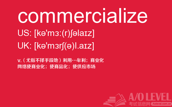 就读于国内学校的学生, 在申请英国学校时需要提交英国a-level考试成绩。很多考生因此英国a-level考试搞得头疼,放松一下,跟着a/o-level考试网来看看英国留学资讯吧!今天课窝a/o-level考试网小编给大家带来a-level考试重点词汇commercialize的全解,对你肯定有帮助。如果您想了解爱德思alevel答案,alevel词汇下载,中国alevel考点,自学alevel申请大学等关于a-level考试的相关资讯,请继续浏览并关注课窝a/o-level考试网。