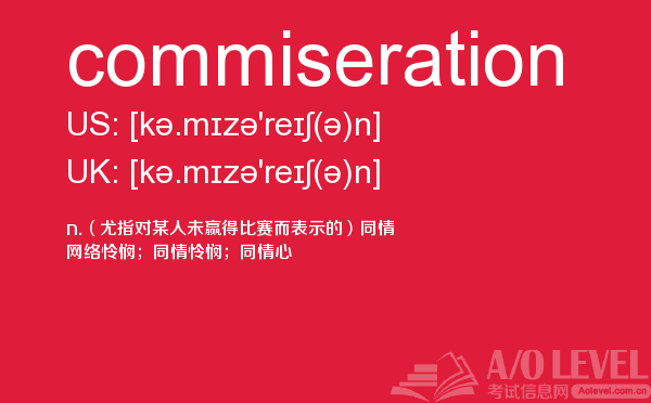 a-level的成绩分为a、b、c、d、e、u六个等级,a为最优,e为通过,u为不及格。如果学生对某门课的成绩不满意,可以选择重考,最终成绩以最好的一次为准。那么a-level考试想要取得a-level高分大家需要做到哪些呢?a/o-level考试网给大家带来的很多a-level考试经验,alevel考试技巧等等,想要考好a-level考试,不仅要知道这些,对于关于a-level考试的所有资讯都需要了解,最重点的是a-level词汇量的积累,今天a/o-level考试网就给大家带来的a-level的考试单词commiseration的全面解析。如果您想了解alevel机构,南京最好的alevel培训机构,alevel数学题,alevel考试形式等关于a-level考试的相关资讯,请继续浏览并关注课窝a/o-level考试网。