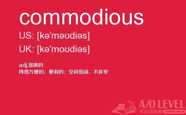 英国a-level入学考试的机会真的很少,每年就5-6月和10-11月两场考试。所以千万别因为不必要的原因,影响了a-level入学考试。为了让大家更好的在英国留学,a/o-level考试网会为大家带来a-level考试相关的资讯,一起来看看a/o-level考试网今天带来的词汇commodious的解析。如果您想了解查询alevel考试报名信息2018,在线alevel培训机构,alevel培训学校,alevel哲学等关于a-level考试的相关资讯,请继续浏览并关注课窝a/o-level考试网。