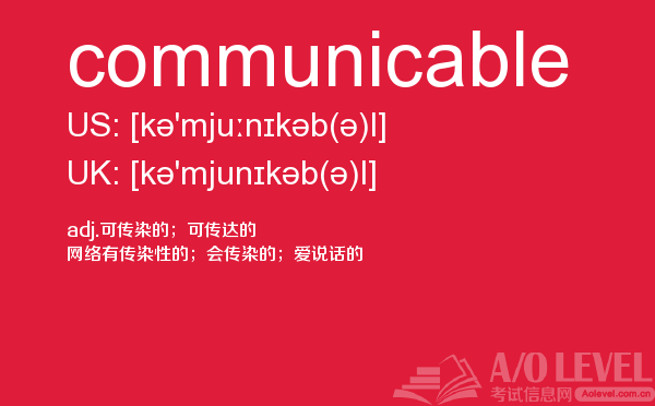 英国以其高质量的教学闻名于世,如果你还在思考a-level考试值不值得考?近几年的英国留学a-level考试的热潮足以证明一切!课窝a/o-level考试网会给大家带来a-level考试真题,a-level考试如何复习?等所有有关的a-level考试资讯。课窝a/o-level考试网今天带来a-level考试中很重要的单词communicable的详细解析,会对你有帮助。如果您想了解alevel课程的适用范围,alevel国际学校,alevel考试日期,alevel经济学教材目录等关于a-level考试的相关资讯,请继续浏览并关注课窝a/o-level考试网。