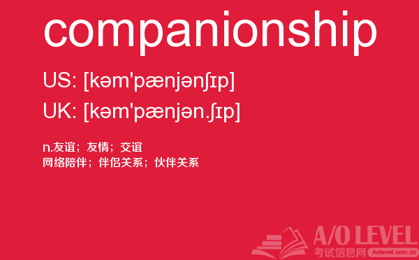 a-level课程适用于年龄在15—18之间,初中毕业以上的在校中学生或具有同等学历的职高生,通常国内a-level学校招收的是高二毕业的学生,并要求参加相关的入学考试,由于a-level课程包括教学及试卷习题等都是英文形式出现,所以这要求学生有较高的英文水平。对于a-level考试适用对象有初步了解之后,下面alevel考试网给大家带来的alevel考试中你需要重点记住的单词companionship的详细介绍。如果您想了解alevel成绩申请国外名校,英国alevel好学吗,a水准考试难度,alevel教材代购等关于a-level考试的相关资讯,请继续浏览并关注课窝a/o-level考试网。