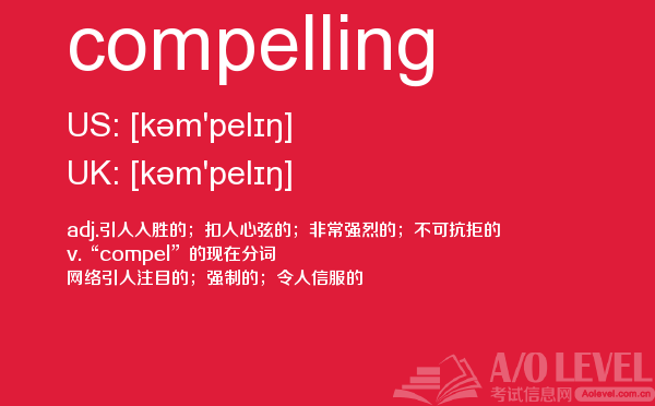对于a-level考试,我们一再强调要加强a-level考试真题实战,多做英国a-level考试真题。放松一下,跟着a/o-level考试网来积累一下a-level考试中你会用到的单词compelling,对你的a-level考试会有很大的帮助。如果您想了解alevel机经下载,alevel美国,中国alevel中心,alevel数学试题等关于a-level考试的相关资讯,请继续浏览并关注课窝a/o-level考试网。