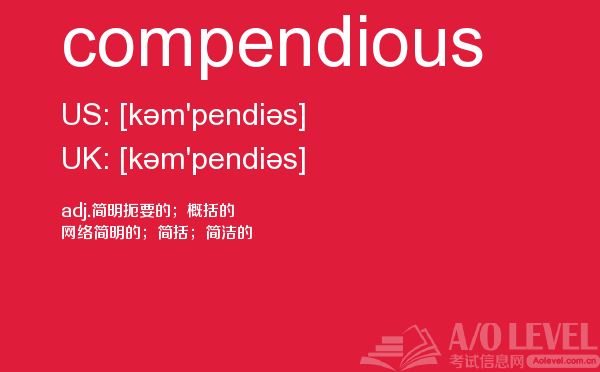 英国留学对于留学成绩的比拼越来越激烈,申请英国院校留学的一大指标a-level考试分数要求也水涨船高.虽然成绩只是申请的一部分,但不得不说,好看的英国a-level成绩是学生是否优秀的证据。放松一下跟着a/o-level考试网来学习一下a-level考试词汇compendious的应用。如果您想了解alevel中文书目,英国alevel课程是什么,alevel课程选择攻略,alevel考试考点等关于a-level考试的相关资讯,请继续浏览并关注课窝a/o-level考试网。