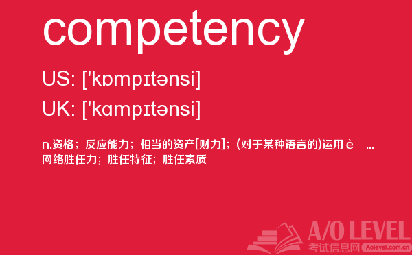 英国留学对于留学成绩的比拼越来越激烈,申请英国院校留学的一大指标a-level考试分数要求也水涨船高.虽然成绩只是申请的一部分,但不得不说,好看的英国a-level成绩是学生是否优秀的证据。放松一下跟着a/o-level考试网来学习一下a-level考试词汇competency的应用。如果您想了解alevel考试登记,alevel经济教材是哪个,alevel机构,alevel物理难吗等关于a-level考试的相关资讯,请继续浏览并关注课窝a/o-level考试网。