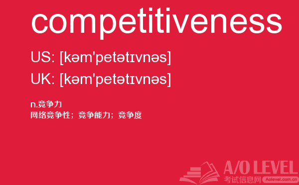 虽然英国a-level院校招生官常把“成绩不是决定录取与否的唯一因素”挂在嘴边,但不得不承认,a-level分数是学生优秀与否的有力证据,取得a-level成绩高分是肯定是优先考虑的。放松一下,先跟着a/o-level考试网来看看今天小编带来的是a-level单词competitiveness的介绍。如果您想了解alevel报名网站,爱德思alevel难度大吗,国内alevel学校,英国alevel考试等关于a-level考试的相关资讯,请继续浏览并关注课窝a/o-level考试网。
