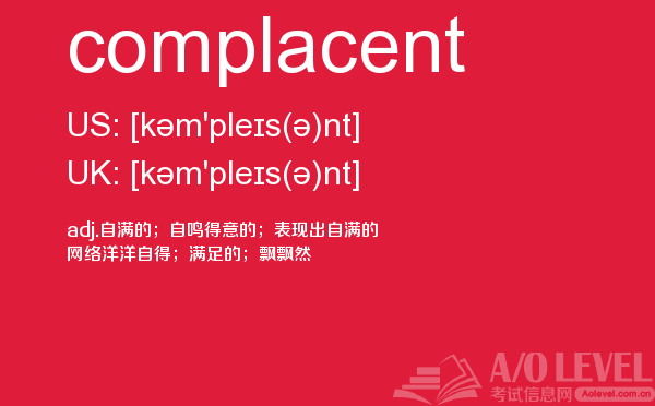 a-level课程证书被几乎所有英语授课的大学作为招收新生的入学标准。 在中国开设a-level课程旨在为中国学生提供进入国外大学的有效途径,具体目标为:培养在国内初高中成绩优秀的学生进入世界顶尖大学;培养在国内初高中成绩中等的学生进入世界一流大学;培养在国内初高中成绩一般的学生考取适合自己的大学。今天alevel考试网小编给大家详细解析a-level考试单词complacent。如果您想了解新加坡a水准学费,南京alevel,爱德思alevel真题,alevel经济学等关于a-level考试的相关资讯,请继续浏览并关注课窝a/o-level考试网。