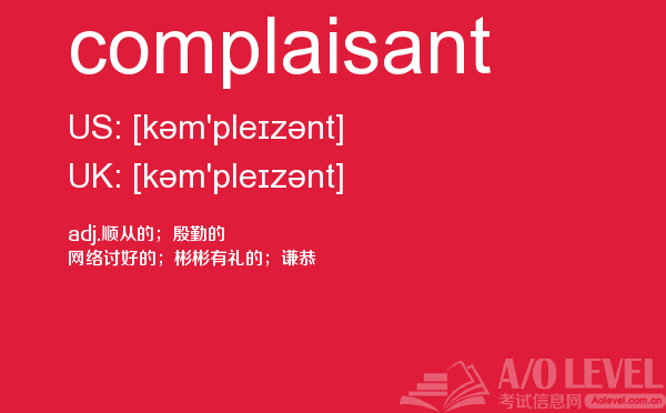 英国高中课程(a-level)的学制为两年:第一年称为as水准,学生通常选择自己最擅长且最有兴趣的3—4门课,通过考试后获得as证书。第二年称为a2水准,学生可选择as水准中优秀的3门课继续学习,通过考试后获得a-level证书。关于a-level学制相信大家肯定有一定的了解,今天alevel考试网想要带大家了解的并不是a-level学制的问题,想要介绍的是a-level重难点单词complaisant,希望对大家有帮助。如果您想了解alevel课程选课,考alevel多少钱,上海alevel辅导哪家好,alevel经济考试原题等关于a-level考试的相关资讯,请继续浏览并关注课窝a/o-level考试网。