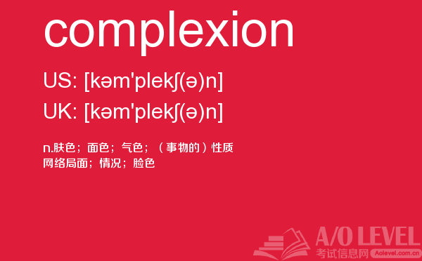 你知道考上a-level考试如何报名吗?最近很多人询问英国a-level考试有多难?到底要不要参加a-level考试培训?抛弃这些,a/o-level考试网老师告诉你,a-level单词最重要,今天带你学习complexion怎么用,希望你认真的学习。如果您想了解英国alevel官网,alevel学校考试难度,alevel数学内容,新加坡a水准考试局等关于a-level考试的相关资讯,请继续浏览并关注课窝a/o-level考试网。