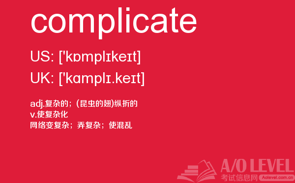 英国a-level考试是英国留学生去英国留学需要参加的考试,很多考生担心a-level考试分数要求高,英国a-level考试难度大,别担心,只要认真的学习a-level考试内容,小编相信大家一定能够考得a-level高分。今天a/o-level考试网给大家带来单词complicate的全面解析。如果您想了解中国alevel成绩申请国外名校,alevel数学名词,英国alevel成绩只有c,alevel申请条件等关于a-level考试的相关资讯,请继续浏览并关注课窝a/o-level考试网。