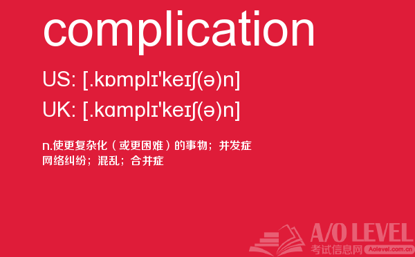众多周知的英国a-level入学考试是进入英国院校的必经之路,所以我们自然不能小看,建议同学们能够加强a-level考试真题的练习,提前明确英国a-level考试报名的具体信息。为了提高考生们的英国a-level考试成绩,a/o-level考试网小编会每天给大家更新a-level留学资讯和alevel考试资讯,今天带来的是关于a-level考试词汇的单词全解,下面带你学习complication的用法。如果您想了解alevel是什么,alevel考试官方网站,英国alevel教材,英国alevel学校等关于a-level考试的相关资讯,请继续浏览并关注课窝a/o-level考试网。