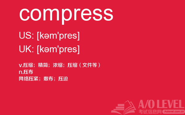 英国以其高质量的教学闻名于世,如果你还在思考a-level考试值不值得考?近几年的英国留学a-level考试的热潮足以证明一切!课窝a/o-level考试网会给大家带来a-level考试真题,a-level考试如何复习?等所有有关的a-level考试资讯。课窝a/o-level考试网今天带来a-level考试中很重要的单词compress的详细解析,会对你有帮助。如果您想了解alevel词汇量,alevel教材,alevel考试评分标准,香港大学alevel成绩申请等关于a-level考试的相关资讯,请继续浏览并关注课窝a/o-level考试网。