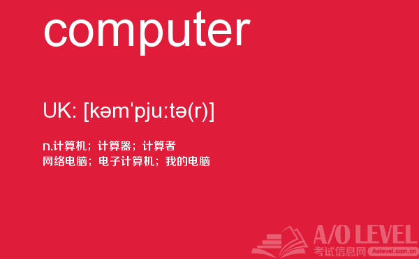 目前,a/olevel逐渐为人所熟知,很多学生都会主动了解alevel考试流程。同时也会抱怨a-level英语题比较难,任务重。那现在我们就放松一下,跟着a/o-level考试网小编来看看a-level考试中要积累的单词computer,认真的学习积累。如果您想了解新加坡国alevel,alevel课程设置,国际学校alevel宣传片,中国有a水准培训班吗等关于a-level考试的相关资讯,请继续浏览并关注课窝a/o-level考试网。