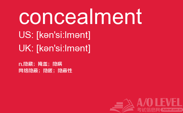 a-level 的考试将由所属的考试委员会分别于每年5-6月和10-11月在全球统一组织,成绩分别在8月和次年2月公布。关于a-level考试时间的具体内容,alevel考试网前面详细介绍过,大家可以查找alevel考试网前面的a-level考试资讯,alevel考试网每天会更新大量的alevel考试资讯,本篇要给大家介绍a-level单词concealment的全面介绍。如果您想了解奥克兰大学alevel,a水准认可英联邦国家,alevel历年考试,alevel容易拿a的科目等关于a-level考试的相关资讯,请继续浏览并关注课窝a/o-level考试网。