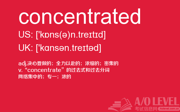 英国高中课程(a-level)的学制为两年:第一年称为as水准,学生通常选择自己最擅长且最有兴趣的3—4门课,通过考试后获得as证书。第二年称为a2水准,学生可选择as水准中优秀的3门课继续学习,通过考试后获得a-level证书。关于a-level学制相信大家肯定有一定的了解,今天alevel考试网想要带大家了解的并不是a-level学制的问题,想要介绍的是a-level重难点单词concentrated,希望对大家有帮助。如果您想了解alevel培训中心,英国alevel排名,alevel历年真题,alevel官方网站等关于a-level考试的相关资讯,请继续浏览并关注课窝a/o-level考试网。