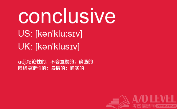 英国的大多数中学开设的alevel课程科目相当广泛,有文科、商科、经济、语言、数学、理科、计算、法律、媒体、音乐等。学生的alevel考试成绩及其所选修的a-level课程在很大程度上决定着能否进入理想的大学和学习所选择的学位课程。关于alevel考试alevel考试网会给大家带来和a-level考试相关的资讯,下面带来的是单词conclusive的介绍,会对大家的a-level考试成绩有帮助。如果您想了解alevel考试报名,a水准h1和h2,alevel高中,alevel参考书等关于a-level考试的相关资讯,请继续浏览并关注课窝a/o-level考试网。