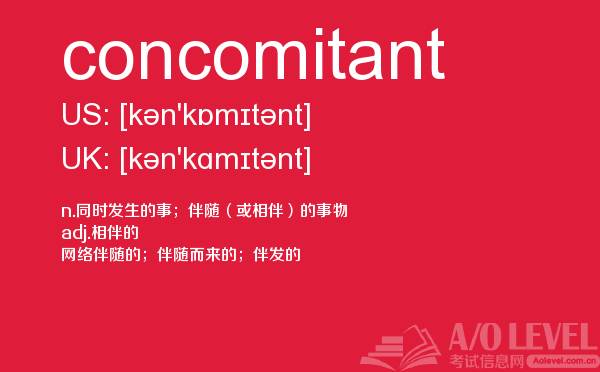 a-level课程适用于年龄在15—18之间,初中毕业以上的在校中学生或具有同等学历的职高生,通常国内a-level学校招收的是高二毕业的学生,并要求参加相关的入学考试,由于a-level课程包括教学及试卷习题等都是英文形式出现,所以这要求学生有较高的英文水平。对于a-level考试适用对象有初步了解之后,下面alevel考试网给大家带来的alevel考试中你需要重点记住的单词concomitant的详细介绍。如果您想了解alevel化学难不难,alevel生物,香港中文大学alevel,alevel报名流程等关于a-level考试的相关资讯,请继续浏览并关注课窝a/o-level考试网。