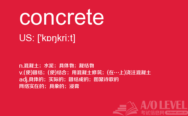 a- level课程一般在中国开设数学、进阶数学(或称高等数学)、物理、计算机学、会计学、商业学、经济学等课程供学生选择。那么关于alevel考生应该选哪些alevel课程呢?以后会给大家详细介绍,今天a/o-level考试网主要给大家全面介绍a-level词汇中的concrete单词。如果您想了解新加坡a水准难度,alevel化学还原氧化知识点,爱德思alevel申请大学,悉尼大学alevel要求等关于a-level考试的相关资讯,请继续浏览并关注课窝a/o-level考试网。