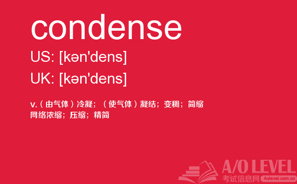 随著学生的素质提升,各大a-level课程培训班的师资和英国a-level题库也不断的完善,近年来学生考出来a-level分数也不断上涨。但是去英国留学,对英国留学资讯和英国的a-level考试资讯都是需要了解的,下面一起跟着a/o-level考试网来看看a-level词汇之condense的详细介绍。如果您想了解了解alevel培训,国际部高中课程alevel,查询alevel考试报名信息2018,墨尔本大学alevel要求等关于a-level考试的相关资讯,请继续浏览并关注课窝a/o-level考试网。