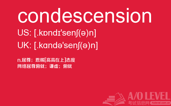 英国a-level学校,从教学质量上来看私立学校更占优势,大部分中国留学生也选择私立学校来读,不过一般都是提前一年来申请学校。中国目前也有20几所a-level学校,每年也同样有走进剑桥牛津等世界顶级大学的学生。所以在国外和在国内都可以选择a-level学校来学习。在前面关于a-level选校的问题已经详细介绍过,那么今天a/o-level考试网小编主要想介绍的是a-level重难点词汇condescension。希望对大家有帮助。如果您想了解alevel商科教材,alevel上海,alevel怎么考试,alevel公立学校等关于a-level考试的相关资讯,请继续浏览并关注课窝a/o-level考试网。