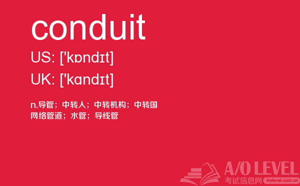 英国高中课程(a-level)的学制为两年:第一年称为as水准,学生通常选择自己最擅长且最有兴趣的3—4门课,通过考试后获得as证书。第二年称为a2水准,学生可选择as水准中优秀的3门课继续学习,通过考试后获得a-level证书。关于a-level学制相信大家肯定有一定的了解,今天alevel考试网想要带大家了解的并不是a-level学制的问题,想要介绍的是a-level重难点单词conduit,希望对大家有帮助。如果您想了解alevel课程选课,考alevel多少钱,上海alevel辅导哪家好,alevel经济考试原题等关于a-level考试的相关资讯,请继续浏览并关注课窝a/o-level考试网。