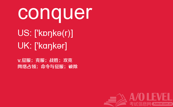 英国a-level学校,从教学质量上来看私立学校更占优势,大部分中国留学生也选择私立学校来读,不过一般都是提前一年来申请学校。中国目前也有20几所a-level学校,每年也同样有走进剑桥牛津等世界顶级大学的学生。所以在国外和在国内都可以选择a-level学校来学习。在前面关于a-level选校的问题已经详细介绍过,那么今天a/o-level考试网小编主要想介绍的是a-level重难点词汇conquer。希望对大家有帮助。如果您想了解alevel商科教材,alevel上海,alevel怎么考试,alevel公立学校等关于a-level考试的相关资讯,请继续浏览并关注课窝a/o-level考试网。