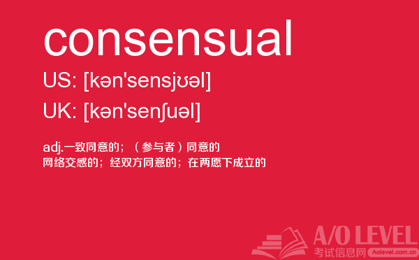 目前,a/olevel逐渐为人所熟知,很多学生都会主动了解alevel考试流程。同时也会抱怨a-level英语题比较难,任务重。那现在我们就放松一下,跟着a/o-level考试网小编来看看a-level考试中要积累的单词consensual,认真的学习积累。如果您想了解alevel是上机的考试形式吗,a水准一年,爱德思alevel真题,alevel考什么等关于a-level考试的相关资讯,请继续浏览并关注课窝a/o-level考试网。