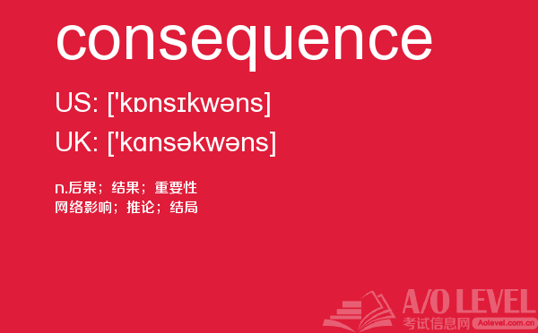 英国留学对于留学成绩的比拼越来越激烈,申请英国院校留学的一大指标a-level考试分数要求也水涨船高.虽然成绩只是申请的一部分,但不得不说,好看的英国a-level成绩是学生是否优秀的证据。放松一下跟着a/o-level考试网来学习一下a-level考试词汇consequence的应用。如果您想了解alevel考试局比较,alevel课程物理,alevel真题搜索,alevel成绩网上查询等关于a-level考试的相关资讯,请继续浏览并关注课窝a/o-level考试网。