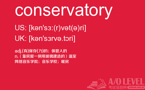 a-level的成绩分为a、b、c、d、e、u六个等级,a为最优,e为通过,u为不及格。如果学生对某门课的成绩不满意,可以选择重考,最终成绩以最好的一次为准。那么a-level考试想要取得a-level高分大家需要做到哪些呢?a/o-level考试网给大家带来的很多a-level考试经验,alevel考试技巧等等,想要考好a-level考试,不仅要知道这些,对于关于a-level考试的所有资讯都需要了解,最重点的是a-level词汇量的积累,今天a/o-level考试网就给大家带来的a-level的考试单词conservatory的全面解析。如果您想了解alevel香港中文大学,上海alevel培训班,中国alevel考点,alevel中文书目等关于a-level考试的相关资讯,请继续浏览并关注课窝a/o-level考试网。